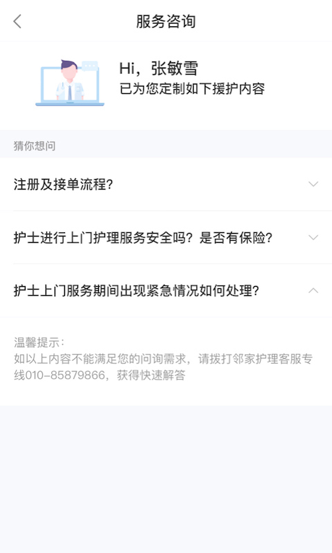 很高兴,通过邻家护理共享平台,我们能够帮助有理想有抱负的护理人员成功建立个人的护理事业。关爱病人、关怀家庭、关心护士、为老龄社会创造价值,是我们的初心,也是我们的诺言。为此,我们将与您携手共筑护理人员护理事业的春天,我们也为所有注册邻家护理共享平台且提供护理服务的全体护理同仁提供全方位的保障!