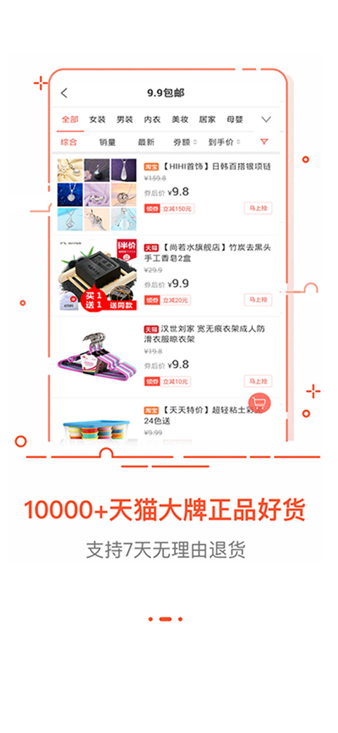 2.多种板块,多种风格:聚划算拼团,今日爆款,9.9包邮,整点抢购,折扣优选,TOP榜单,优惠券直播,天猫品牌汇,今日上新。打折、导购、优选、团购、优惠,一大波白菜价折扣商品、值得买的好货迎合每位用户喜爱。