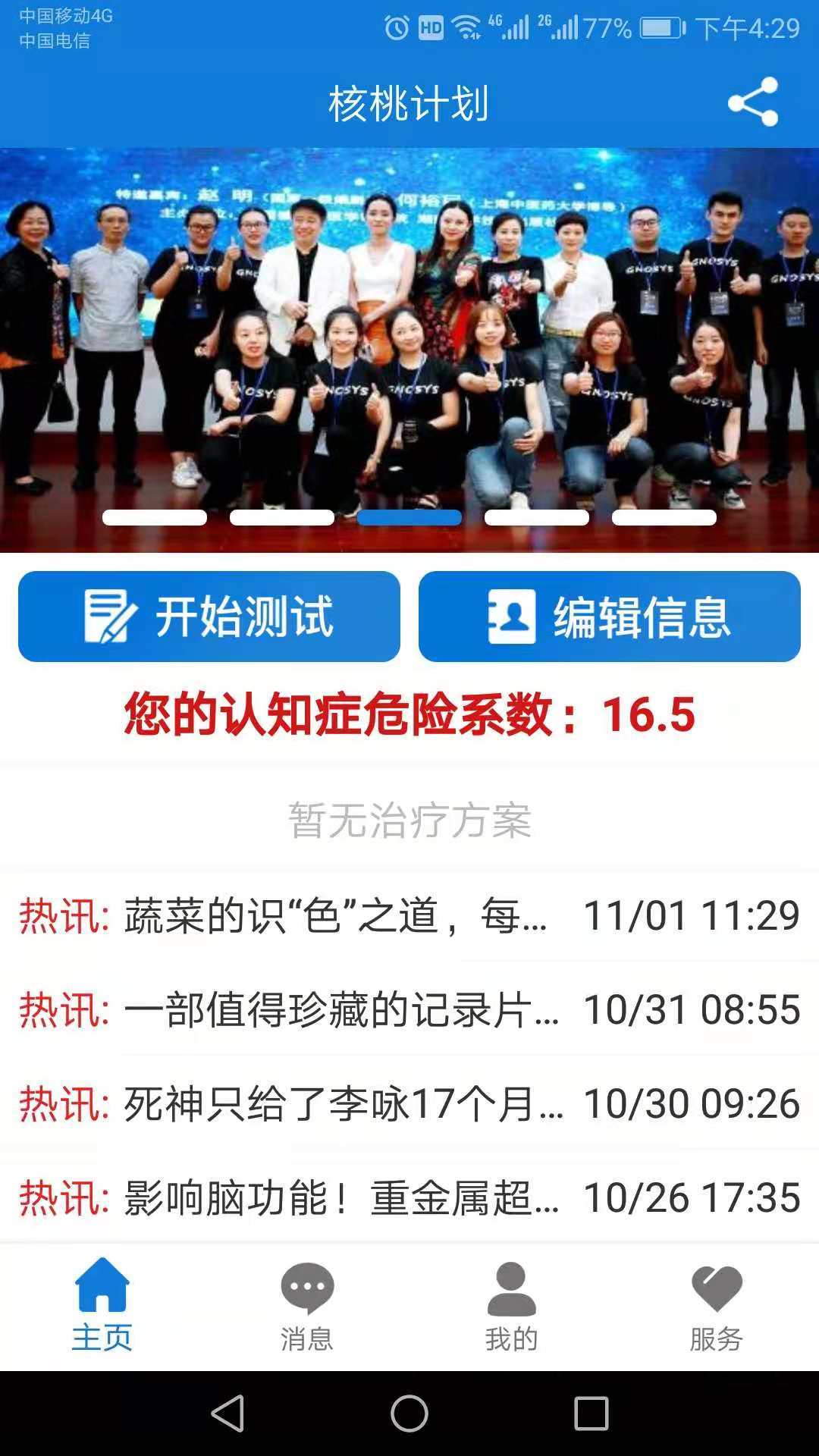 这是一款防治AD的手机应用软件。可以线上检测自己是否患有认知障碍的倾向,并可以推荐线下专业的检测机构来进行检测和治疗,让认知症无所遁形;推荐专业的个性化治疗方案并提供线下特色私人服务,让认知症不再可怕。“核桃计划”,解决AD难题,创造全新模式,让老年人健康而优雅的享受生活!