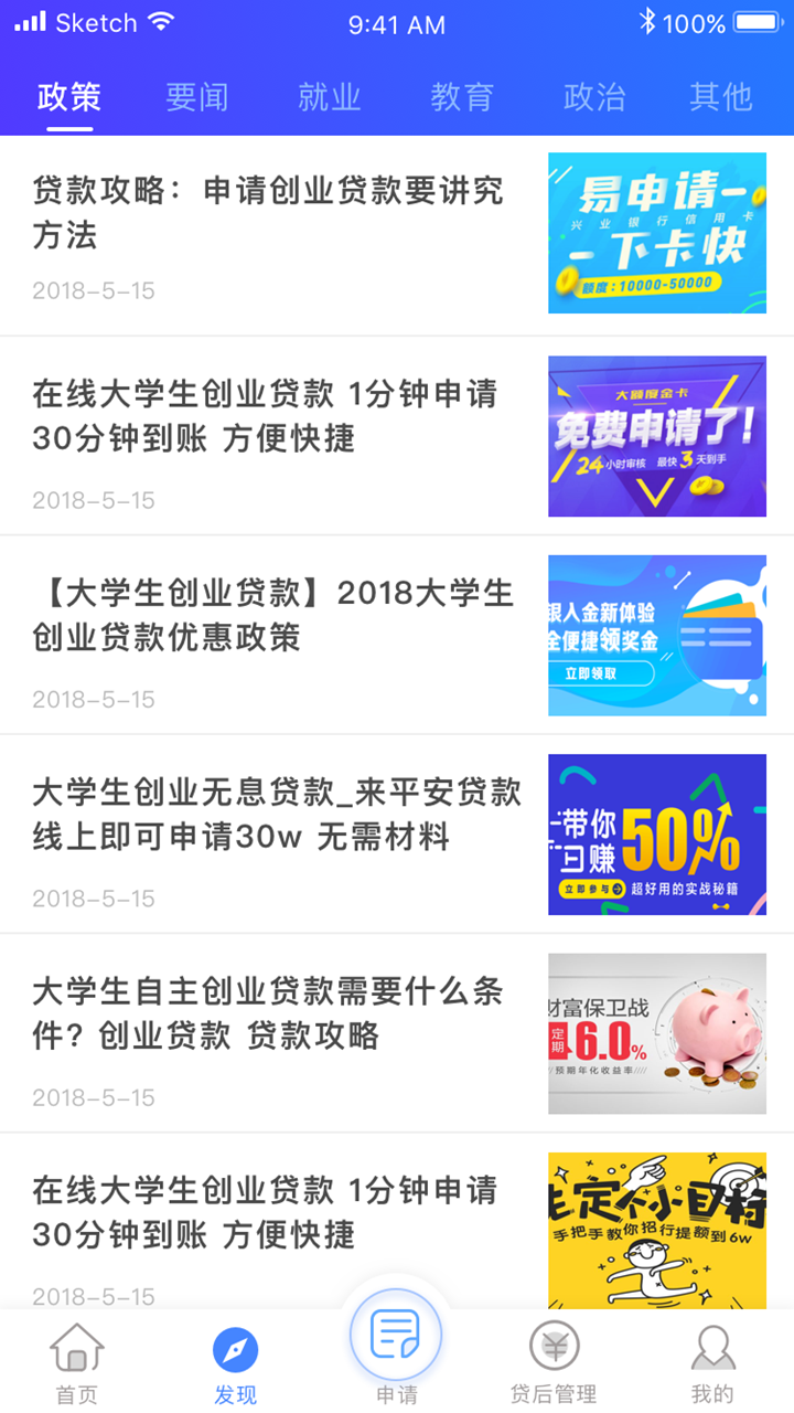 ③用户可在“发现”页面通过顶部快捷标签,方便地浏览各个类别的信息。创业政策、活动、经验知识一网打尽;每一类别下,以文章列表的形式展现内容,清晰简洁明了;
