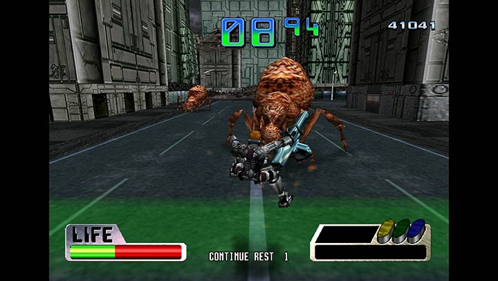 DC和街机上很经典的越肩视角动作射击游戏,游戏的主题简单明确——就是打异型,玩家操纵的角色有三种武器可以切换,不同的武器威力不一,当然发射的蓄力时间也长短不一,所以要随机应变来切换武器加快进攻速度。