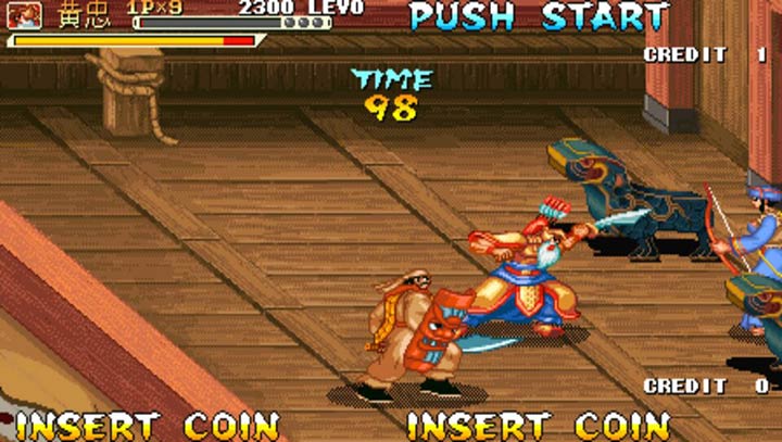 三国题材的经典街机闯关游戏,115版是早期的一个版本,支持无敌,无限命等可选作弊在开始画面按键选择隐藏人物:诸葛亮 →→B←↓→C←↑→D←←B貂禅 ↓→D↑↓CCCC ←→B↓↑张辽 D↑→↓←B←↓→↑C↑↓←→