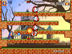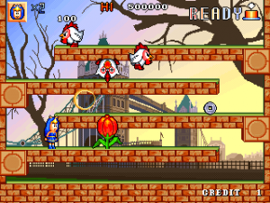 《异想世界 地球的危机》是一款动作游戏,玩家要扮演一名女孩,用魔法球击退敌人。游戏舞台像《雪人兄弟》那样固定,消灭完所有敌人即可通关。