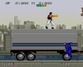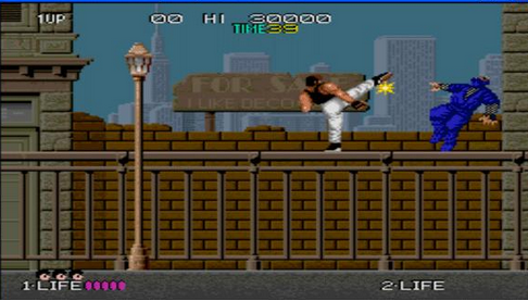 Data East出品,88年的动作游戏类型开始成熟起来。本作操作和手感和游戏的流畅度都非常出色。故事讲述的是主角为解救被绑架的总统而和忍者开战的故事。游戏人物动作很多,还有刀、双截棍等道具可用,操作简单,很好上手。游戏人物按住攻击键可以蓄力,相当于会心一击,威力很大,需注意的是,人物只有在不动的情况下才可以开始蓄力。