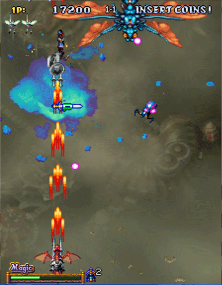 经典竖版彩京飞机游戏,骑士骑着飞龙的飞机游戏。除了射击共有的发射子弹和导弹外,另外还有人龙分离的招式,画面非常华丽。