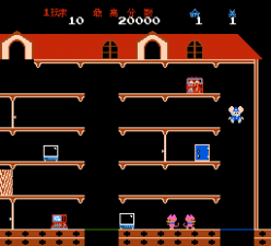 超经典FC游戏,由日本南梦宫于1983年发行的游戏,玩家扮演着一只叫做 Mappy 小警察的老鼠,取得物品,并躲过猫咪们的攻击,即可过关。
