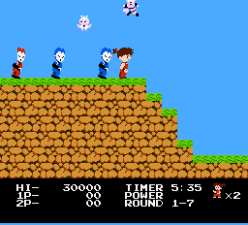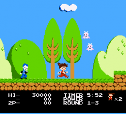 《快杰洋枪》——为救出公主,主角洋枪丸要在全部7个版面中展开冒险,本节目是从街机移植的动作游戏。一个穿着红色衣服的小男孩和忍者进行斗争的游戏,着数不是很多,基本就是拿着手中的刀旋转着杀忍者。红色的忍者会发标,一不小心就会中标而亡,需要跳起来躲避。如果呆在一个地方不动会有很多敌人出来,所以可以一直望前走动。
