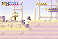 这是GBA早期一款射击游戏,游戏系统独特,能为枪械装备徽章和怪物形态,以此发射出不同的子弹。除了射击外,游戏还引入动作元素,譬如可以按着下 跳跃来铲腿。