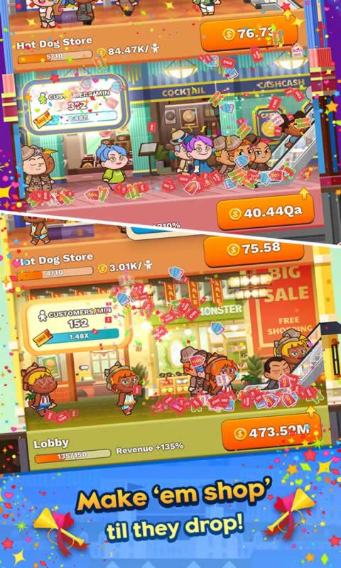 放置商场大亨游戏是一款轻松放置题材的商场经营游戏,在游戏你将扮演一个商场的经营者,通过不断扩张商场规模,雇佣新员工使自己商场收入增加。玩家作为商场的主人需要收进更多新颖时潮的商品也激发更多顾客的购买。
