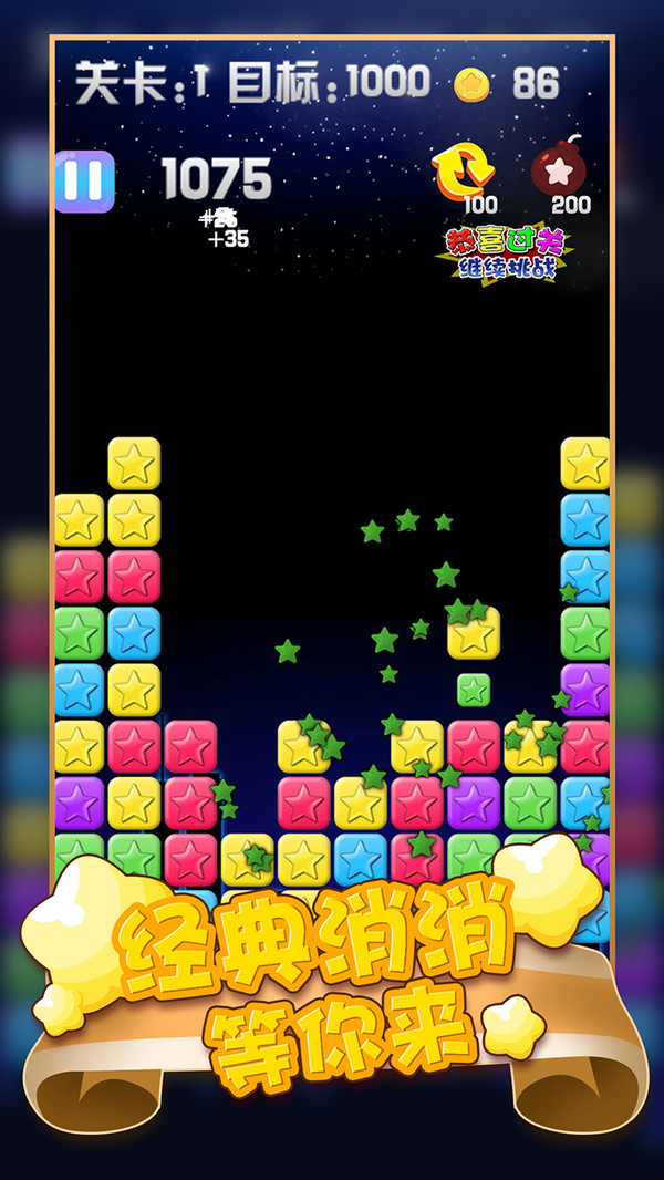 《消灭满天星星》是一款简单好玩的休闲益智游戏,无道具模式,全靠技巧取得高分,无关卡限制,自动保存游戏记录,够本事就来挑战吧