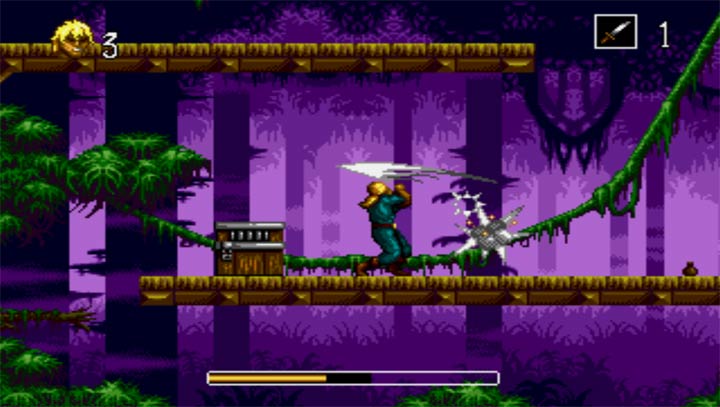 世嘉卡带游戏 可选三个人一个武士,一个女战士,一个力士。第一关在丛林中战斗,从第二关开始,可以在地图上选关,没过一关可以得到一块宝石。第二关可以打僵尸关,在阴暗的城堡中……通关画面就是这双手捧着这颗宝石过关。类似于恶魔城的类型。开篇画面是一艘船在航行,有一种不致命的生物。
