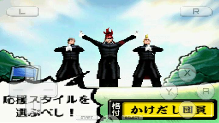 本作将会通过夸张有趣的漫画风格营造出热血氛围,玩家扮演应援团成员,为各行各业的人们加油助威。帮助的对象包括重考3年的浪人考生、被前辈欺负的上班女郎乃至参加比赛的赛马等。本作采用音乐节奏动作的方式进行,玩家要按照画面提示与音乐的节奏,通过触摸屏进行相对应的节拍输入。富有任天堂特色的另类风格游戏。本版为菜单汉化版,只汉化部分菜单。