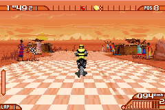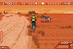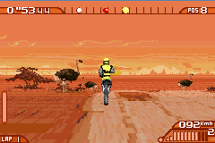 游戏可以说是FC和GB上那款越野摩托车的进化版,游戏画面当然漂亮了不少,比赛中的人物也都有了自己的造型,游戏方式与之前倒是没什么变化,同样是在横版卷轴里翻越障碍做出各种特技。