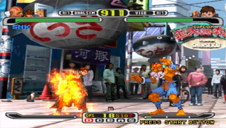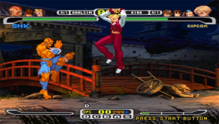 SNK和卡普空合作推出的一款“梦幻格斗”大作,游戏集合了《街头霸王》和《格斗之王》里的三十多名角色,战斗模式分为SNK和卡普空两种,SNK模式可以象《格斗之王》中那样蓄气,卡普空模式不可蓄,但有三段超杀。另外还保留了《街头霸王III》中的快进、疾退、大跳等基本系统。推荐给喜欢格斗游戏的玩家。