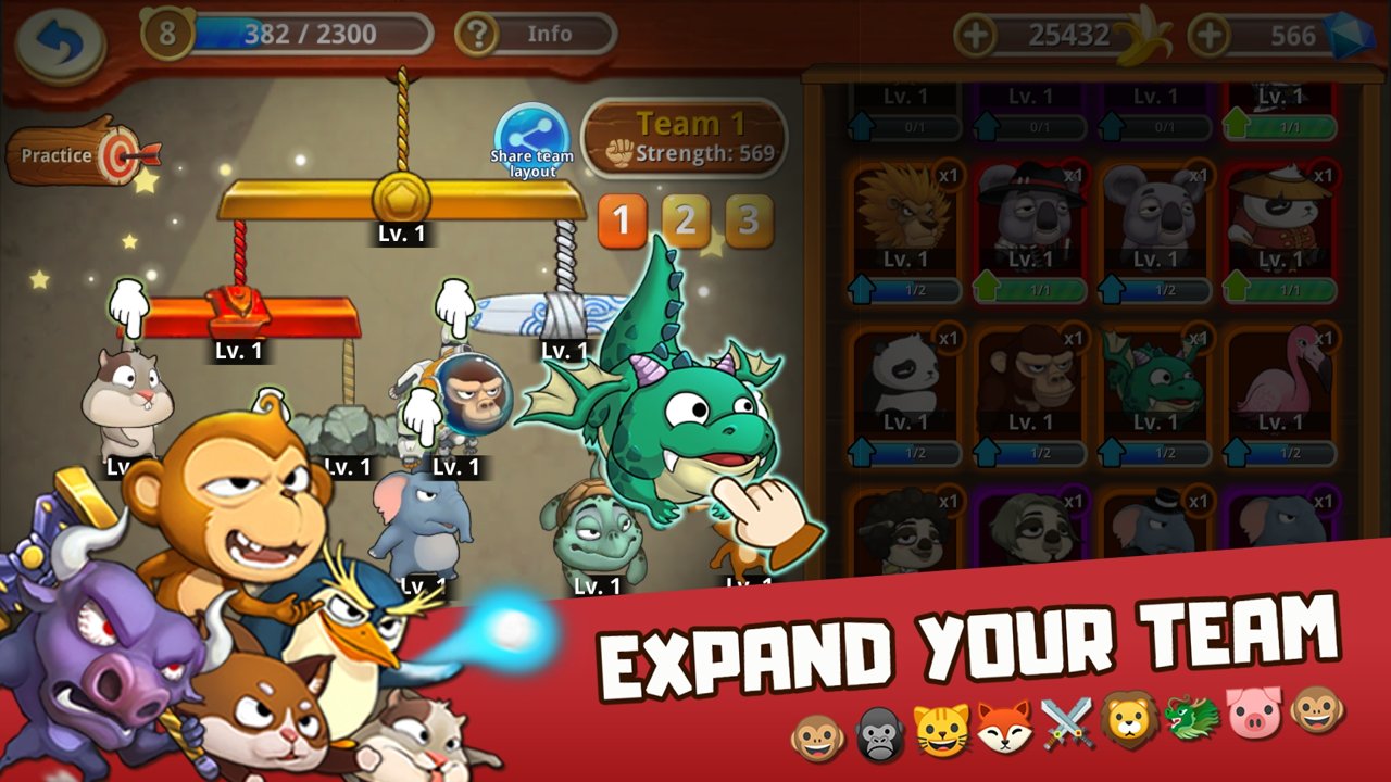 2、森林中的动物都到齐了,任你尽情的收集解锁,挑选它们一起战斗;
