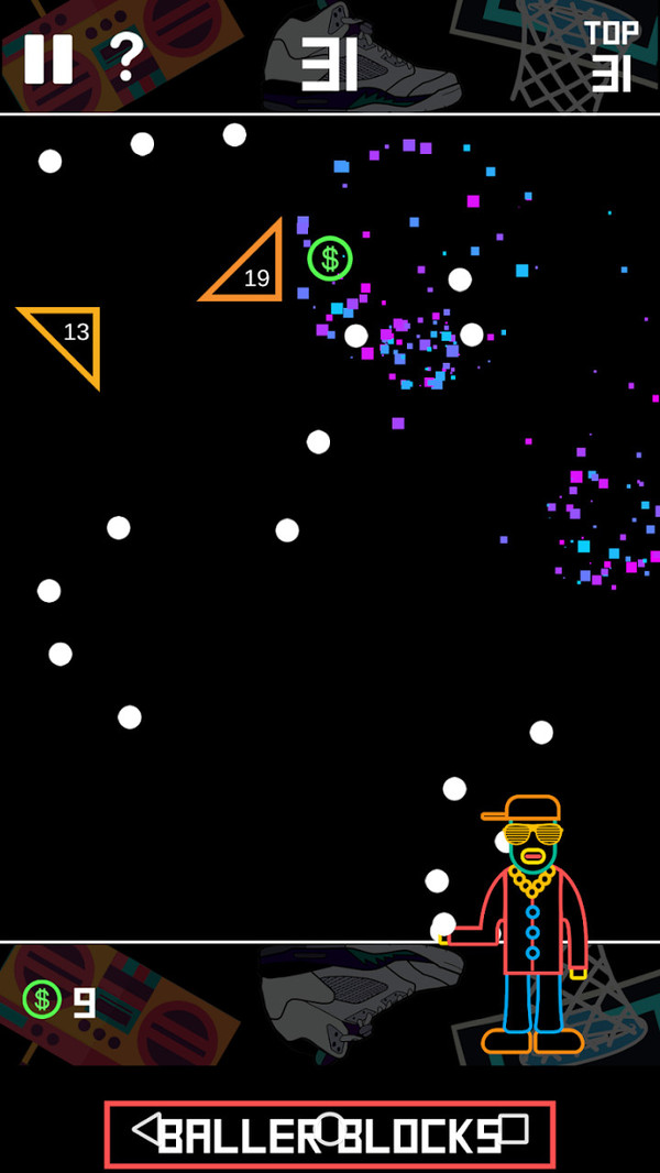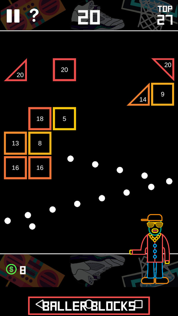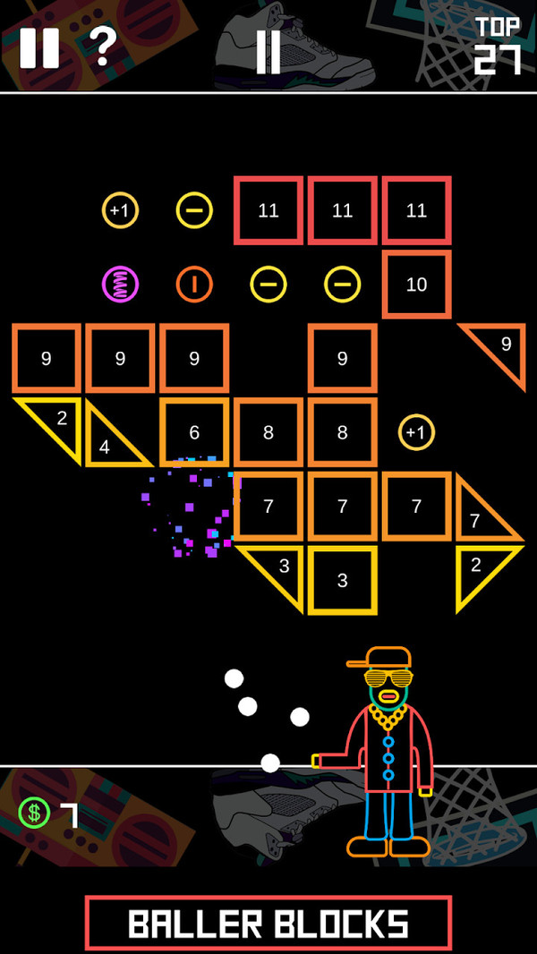 这款游戏全新的嘻哈风格的画面造型设计让打砖块更加的有趣,游戏玩法简单,非常适合打发时间!小小弹珠想要成功射击到足够多的砖块,可不是一件容易事。