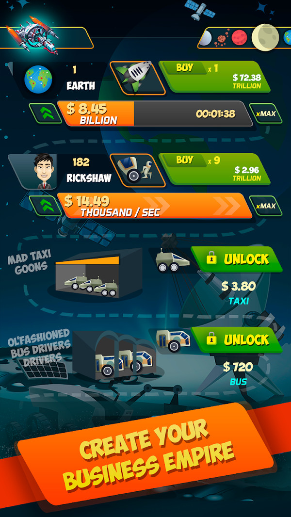 这款游戏中你将体验到什么叫做亿万富翁,你有数不尽的财宝可以随意挥霍。开始只有四块钱,您的目标是投入这笔钱,以便您可以创建自己的业务。