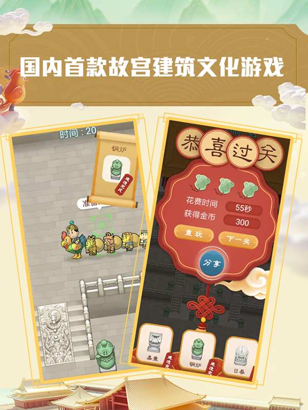 游戏中还具有收集的玩法,玩家可以在收集文物的过程中,探索每一件故宫文物背后更多有趣的历史事件。不需要任何操作,在游戏开始后,玩家扮演的仙人就会自己向前走动,当路径的前方出现墙壁或者障碍需要方向转换的时候,我们只需要在屏幕的任意位置向希望移动的方向滑动即可。收集路途中的建筑材料,带着身后的小帮手去填满建筑地点的格子就可以顺利通关!游戏建筑需要填补的方格也是十分多样,简单的I型,田字型、L型,再到复杂一些的九宫格。单独看每一种类型对玩家而言并无难度,但在故宫的建造关卡中与地形和建筑材料的相结合,可不仅仅是要填满各自就会完成,如果移动和材料收集的顺序出现偏差,会让你所在的关卡直接无法通关,最后只能重新开始。