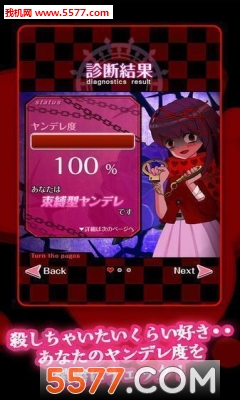 狂气的病娇诊断汉化版基于游戏最新版汉化,《狂气的病娇诊断》这款游戏可以让人知道,自己和“发病”之间的距离到底有多远。整个游戏的过程只需要做选择题,最后由程序计算出玩家的“病娇度”并给予建议。当然啦,测试之后若发现自己中枪,也不要太在意,游戏而已!