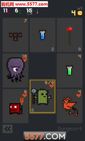 你可以将你的角色卡片移动到九张卡片上。怪物卡片和陷阱卡会降低你卡片的健康状况,治疗卡会......好吧,治愈你,金卡会增加你的游戏分数,还有许多其他卡片具有独特的能力和行为。