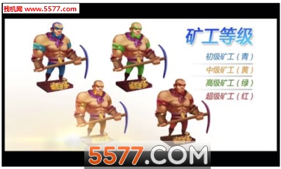 初级矿工青色、中级矿工黄色、高级矿工绿色、超级矿工红色。