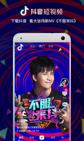 抖音短视频是一款中国广受欢迎的原创短视频分享平台。全球潮流音乐搭配舞蹈、表演等内容形式,还有超多原创效果、滤镜、场景切换让你的生活瞬间变大片,刷爆朋友圈的魔性短视频由你打造。还有更多精彩等你来体验,快来下载吧!