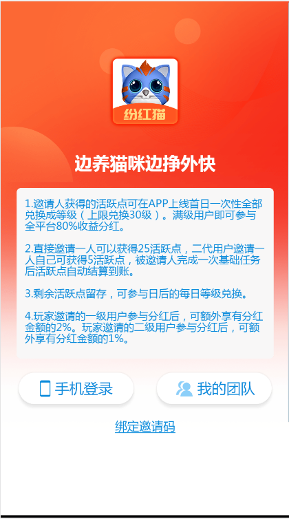 分红猫是一款手机上养猫咪轻松拿分红赚钱的客户端应用,分红猫软件赚钱模式类似于养宠物升级赚钱,用户通过做任务看广告获得活跃度将猫咪升级,分红猫上猫咪等级越高赚的越多。