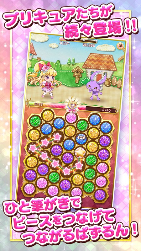 光之美少女连接消除(プリキュア つながるぱずるん)是一款改编自光之美少女的消除RPG手游,游戏中玩家一次消除的色块越多对敌人的攻击伤害越高,如果消除和使用的光之美少女相同的颜色的色块即可发动必杀技。