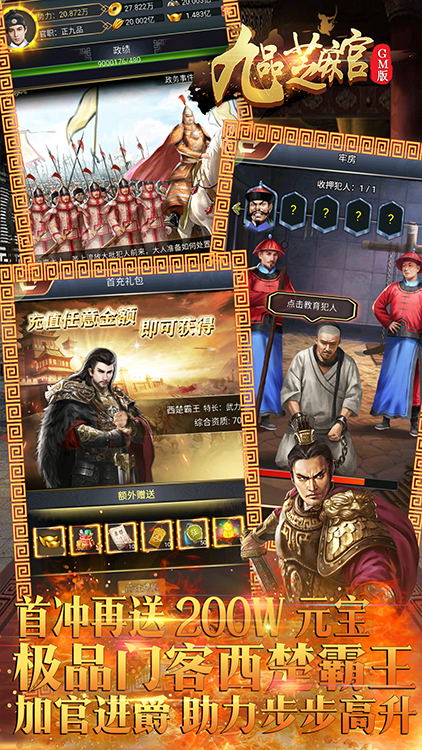 九品芝麻官无限元宝破解版是一款值得推荐的古风当官游戏,以历史题材为背景,还原故事情节、人物,让你身临其境体验官场争斗,还能随时离线挂机升级哟!