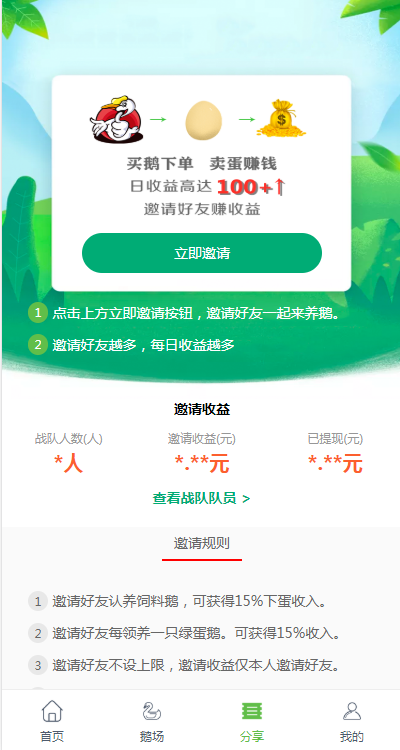 入门鹅:投资100元领养,每日可得5元利润分红。(可领取365天停止,每人限领养一只)