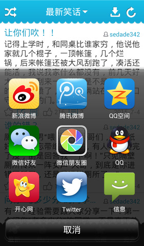 2、适用新浪微博、腾讯微博、QQ空间、QQ好友、微信好友、微信朋友圈、开心网、Twitter、短信、邮箱等快捷分享;