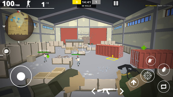 当我们来到游戏中的时候,便是能在里面扮演一个方块人进行战斗。手中的武器也是十分强悍,戴着防毒面具看着特别的魔性。里面的画质操作手感还是不错的。