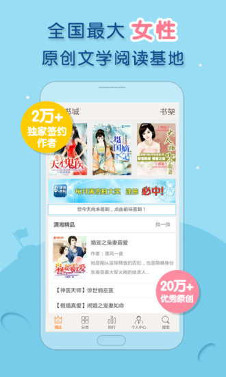 潇湘书院是一个手机看书软件,让用户追剧阅读更加的简单方便,喜欢的用户可以在这里看到各种图书软件,喜欢写作的用户也可以在这里进行文本创作和发表,用户的使用也更是简单方便。