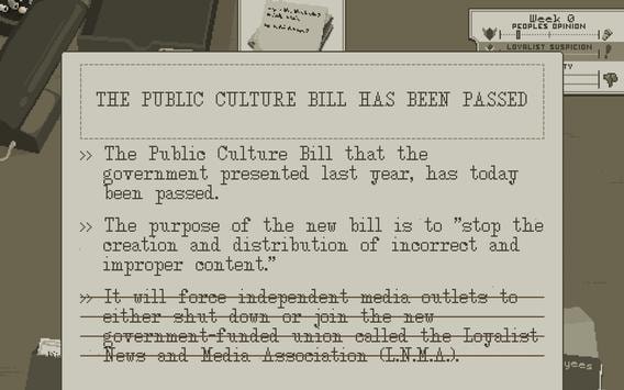 在本作中,玩家通过阅读故事,了解战后国家,作为最后独立报纸的编辑活着。
