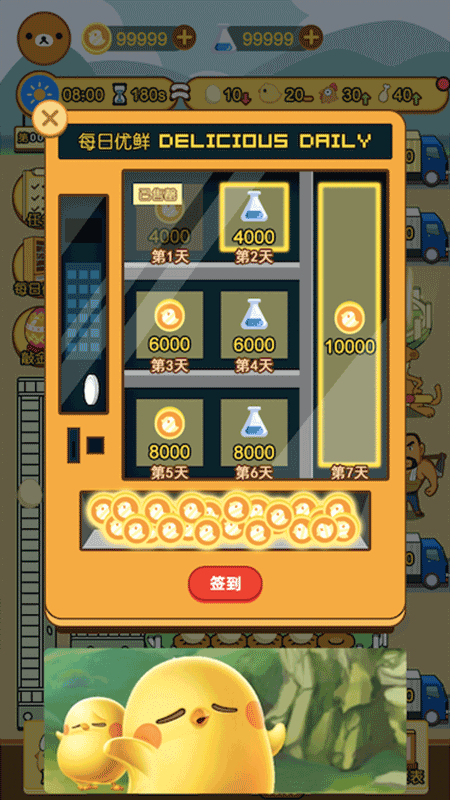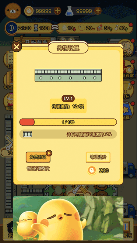 养鸡一百天是一款玩法丰富的休闲养成游戏。在这个游戏中,玩家作为这座农场的农场主,白天开启流水线,负责鸡的饲养和向鸡肉串等产品的转化,夜晚提升机器的生产效率、改良小鸡的品种,反复进行昼夜循环,不断提升养鸡场的生产规模和效益,培养更多小鸡,打造属于自己的豪华养鸡场,获得更多收益!