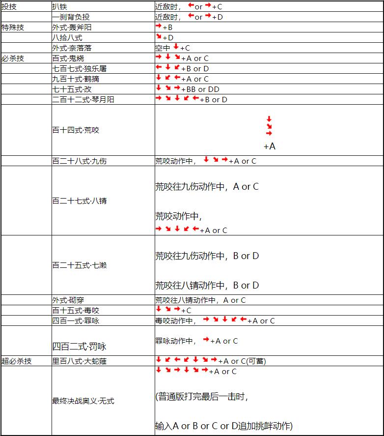 拳皇98相关问题大全基本共通操作各人物角色出招表霸体超必杀技表打击防御必杀技表出招表隐藏要素特别结局背景音乐的秘密隐藏角色使用方法援护攻击角色相性表EXTRA模式专用操作ADVANCED模式专用操作