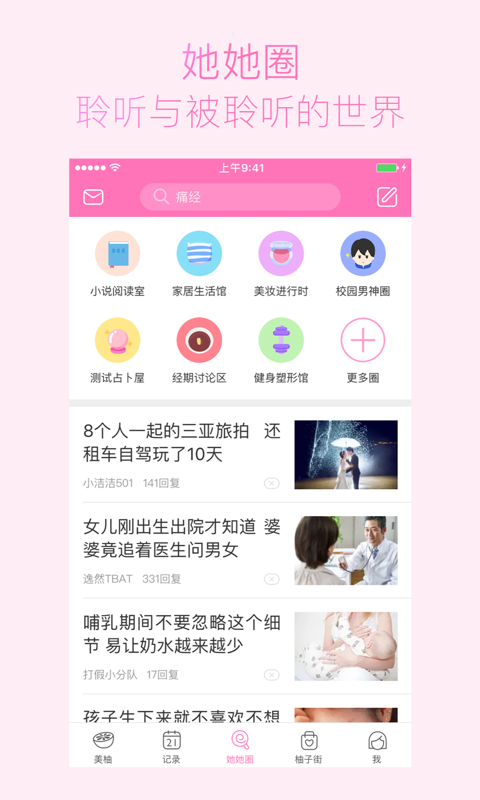 开启经期、备孕、怀孕、育儿四大模式,陪伴你从校服到婚纱,从少女到妈妈,不同时期给你特殊的照顾。