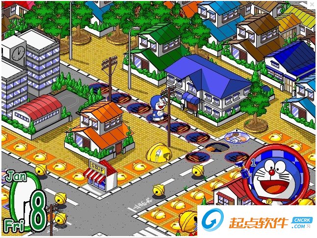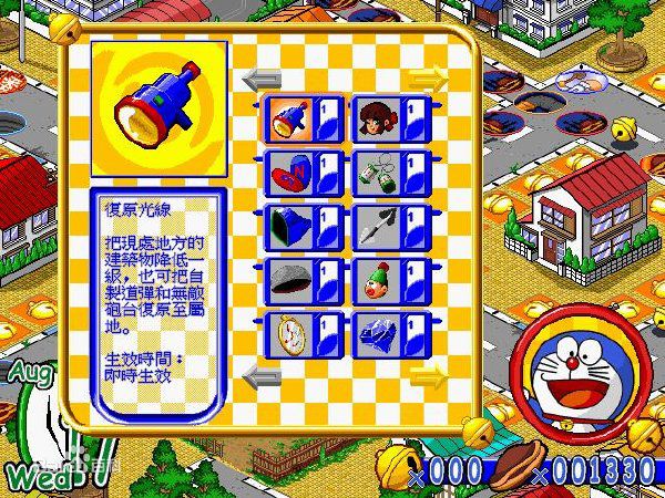 道具 所有道具都源自哆啦A梦的百宝袋,玩家可以利用道具来帮助自己,每个道具都有功用,但玩家必须停在道具店前或路过道具店才能购买或售出道具,但道具竹蜻蜓有bug,出现玩家出售竹蜻蜓时的卖价比买价高一倍。