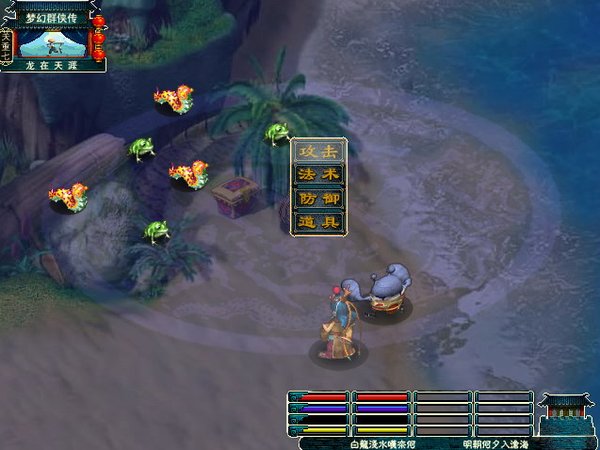 东海湾走不远就有只红色蛤蟆,先不要冲上去傻呼呼地对话,先去找那个卖药+卖暗器商人买点飞刀。最多20个,没钱的话买10来个也可以。然后再去跟毒蟾王对话,开打。(必败)大家不要学我,我K了他半天,他血早光了,可是就是不死……后来才想着是不是剧情必败,55555,害得我重来一遍。而且这只蛤蟆老放毒雾,想被他砍死还真不容易。败了之后又是剧情,这时候我们游戏第一女主角——铃音出现,继续对话,然后再开打。(这次必须打赢哦)其实铃音打怪掉得血还没小白多,汗。好不容易K死蛤蟆(别忘了再去买几十把飞刀),回到龙宫,然后铃音会要求去找夜明珠,2个人从右上角传送点来到海底迷宫。沿着路走,多升几级,然后来到宝库,打千年恶蛟。全扔飞刀吧(这东西真好用),扔个几十下就死了。完了又是剧情,原来那个恶蛟是你的叔父,回到龙宫,剧情,然后铃音离队。
