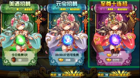 进入战斗前,玩家可以通过布阵搭配上阵武将,不同职业的武将和各武将独有的技能都将左右一场战斗的胜负。武将分为卫军型、猛将型、暗杀型、谋士型、辅助型,具体长处就顾名思义啦。后期将加入武将“情缘系统”之类互相增益的设定,在武将的选择和培养上又增添了一个策略性元素。