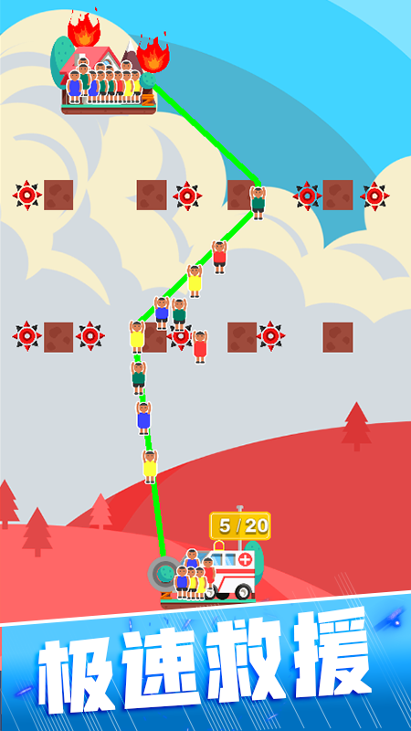 "《救救打工人》是一款模拟一群打工人在遇到火灾时请求救援的游戏,你需要做的事就是动用你聪明的大脑去思考如何利用环境将所有被困的打工人们都拯救出来,当然,救援路上也会遇到重重阻碍,这也是你需要克服的地方。