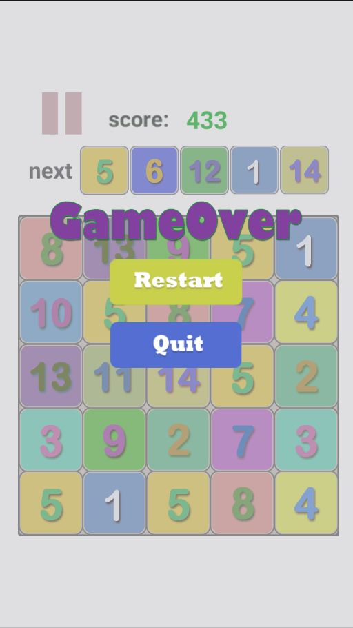 如果格子中有数字并且等于当前的数字,那么当前数字会移动到选择的灰色格子下,数字会加1并且得到数字加1的分数,然后界面中加载Next 中的数字。直到数字中得到21或者所有的数字都没有可以到达的格子游戏结束。