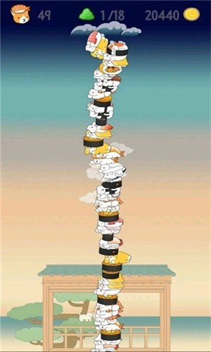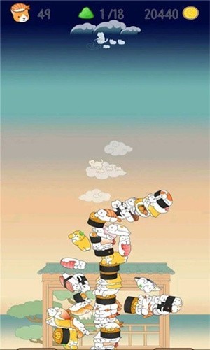 游戏的操作方式非常简单容易上手,仅需将下坠的猫猫寿司准确垒在一起即可,玩家需要耐心地调整方向和下落角度,帮助小动物们不停叠高高,高度越高,玩家所得的分数也就越高,游戏会记录你的最好成绩。