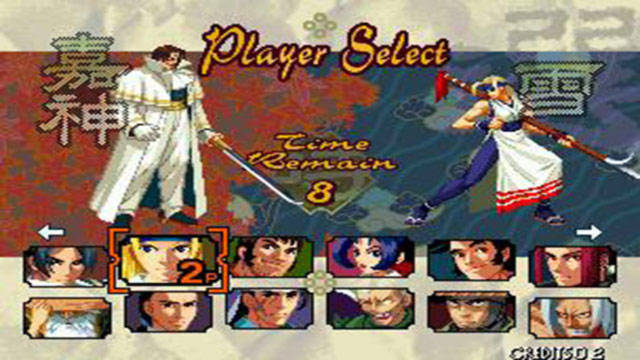 嘉神 慎之介(一开始为表状态,在气槽满或血红濒死以后可按B+C+D键觉醒):在选人画面中,3秒内依次按 C 6次, B 3次, C 4次,画面会出来两个箭头,把光标移到箭头处里晓武藏的↑和↓即可。(注:NeoGeo版才可选择嘉神,街机版不可选择)