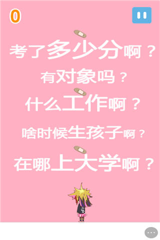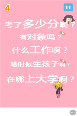 小伙伴们每次回家,一大堆的三姑六婆就会跑过来问东问西。内心强烈的想法就是要他们全部消失掉。。。在这款游戏中,刚好可以一泄心中的怒火。