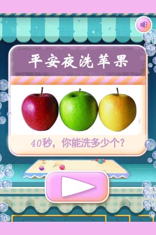 妈妈告诉我们苹果弄脏就不能吃噢,大家快来洗苹果吧,看看在规定的时间40s内看你能洗多少给小苹果送给小朋友们。