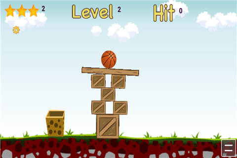 游戏中,玩家得想方设法把在箱子上的篮球搞进竹筐里面,一旦篮球落地玩家需重新来过。
