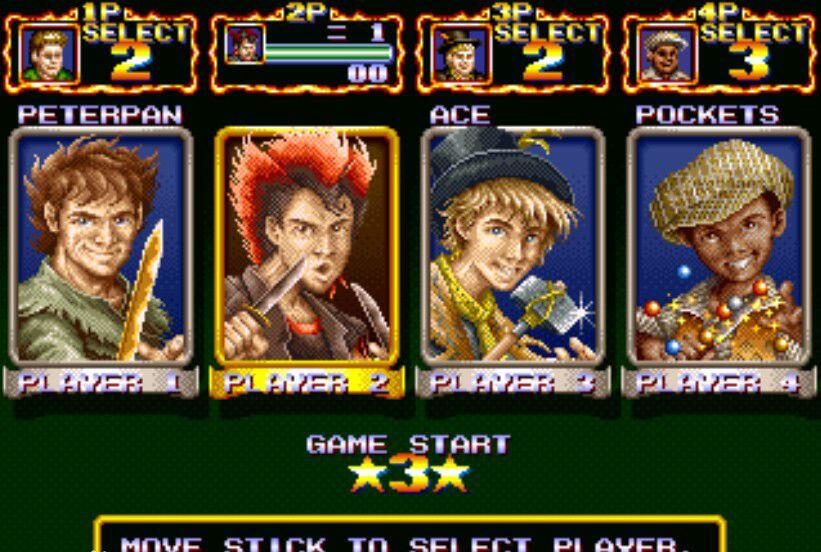 共有五个角色可选,老大彼得潘、老二双刀、老三企鹅小子、老四娃娃和老五胖子,其中数老大、老四、老五较为厉害一些,另两个攻击力太差,单打通关不易,而用其它三人均可轻易通关游戏的故事背景就是消灭邪恶的铁钩船长,主角们的放血绝招各有不同,不过威力并不大,耗血反而很多,所以较少人会有这招!这个游戏可以无限循环地打,高手都可以打N个小时以上的。