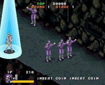 街机版<月亮步>大概是除MD版外,唯一一部值得一玩的杰克逊游戏了,不过它比MD版还要差点-本作的类别介于射击游戏与动作清版游戏之间,幸运的是,MD版的绝大部分出彩要素都被沿用-默认值下,按住开火按钮可以放出电荷杀死敌人-你依然可以引诱敌人跳舞,只不过这次不再耗费你的生命槽,而且还能通过营救小孩获得补充-当你找到Bubbles后,你会变身为一个机器人,换用导弹与激光来消灭敌人-经典的街机游戏,自带的模拟器为MAME。