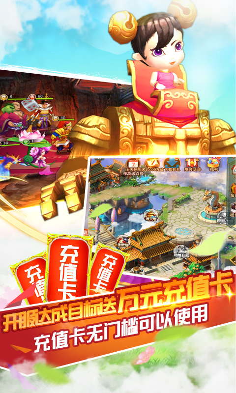 《幻想大乱斗-万充千万钻》游戏拥有放置类的优秀特点,碎片化时间,轻松休闲。无论你身在何处都能体验到最畅快的游戏体验,以中国神话时代为背景,架空历史年代,乱斗世界。登录送至强英雄二郎神、千万钻石、极品橙武,助你战力猛彪通关压力。上线送SVIP1,vip特权免费享、贵族礼包全部1钻领。白给送万充,新服达成目标送10000充值卡。更多福利等你来。